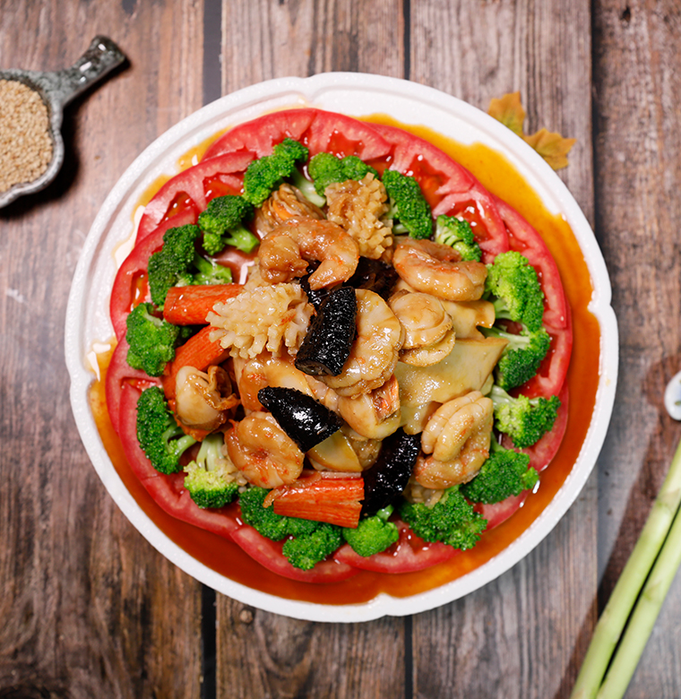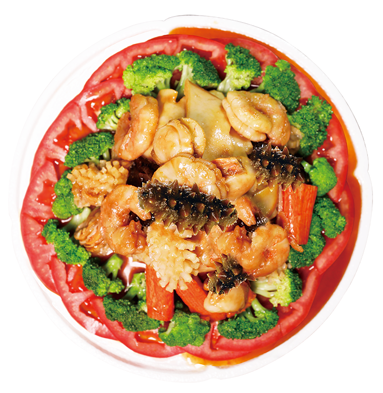 食材包:蝦仁、鮑螺、魷魚、蝦夷貝、海參、蟹足棒、西蘭花 湯汁包:飲用水、羥丙基二淀粉磷酸酯、蔥油﹑釀造醬油、蠔油、味精、雞粉調味料、釀造醬油(含焦糖色)、胡椒粉調味粉